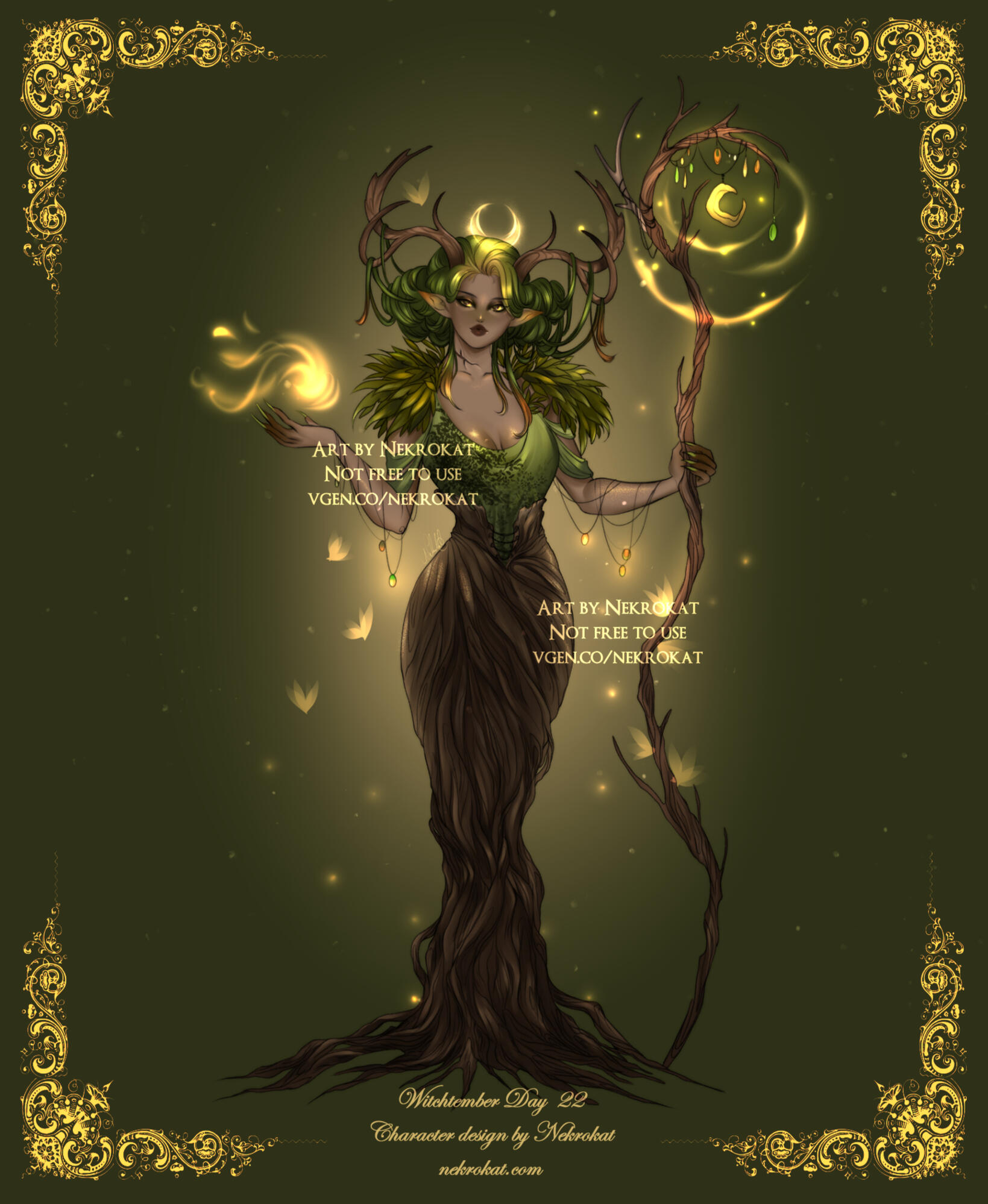 Forest - Once an elven child left in a barren land full of ash and destruction. Her spark of hope and connection to nature raised a lush forest around her over the centuries. Now she's one with the forest, maintaining balance between life and decay. Her fi